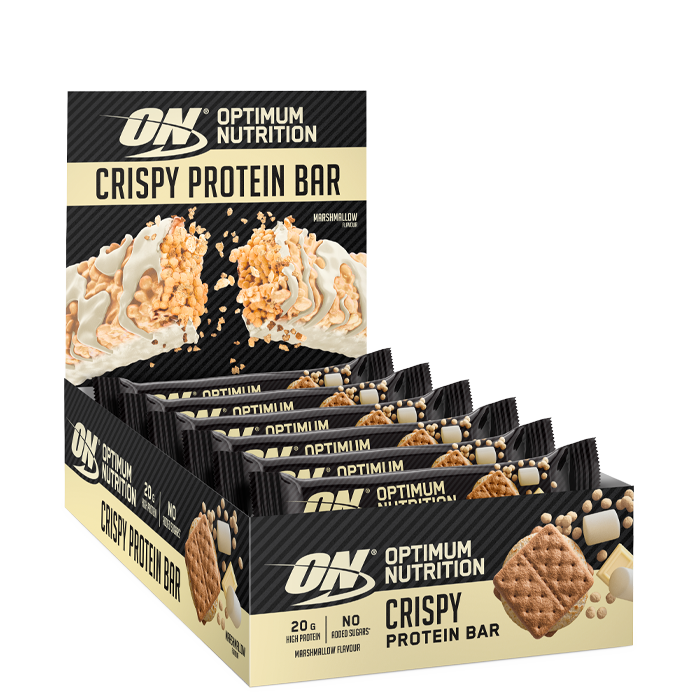 Optimum Protein Crisp Bar indeholder 20 g kvalitets protein i kombination med et lavt sukkerindhold.