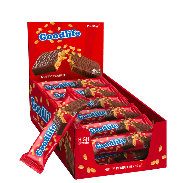 Køb en kasse Goodlife bars som indeholder 15 bars á 50 g. En Goodlife bar giver ca. 190 kcal, 16 g protein og 20 g kulhydrater og er et perfekt mellemmåltid – når som helst på dagen!