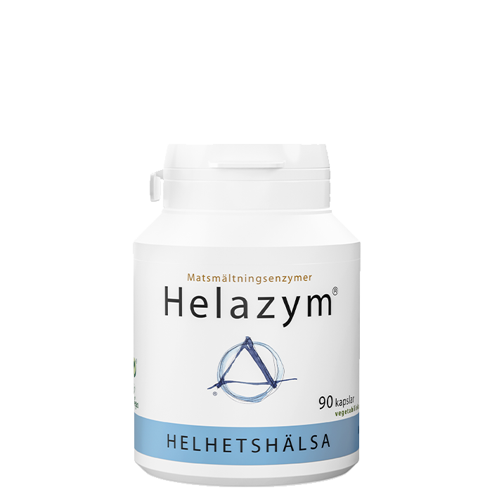 Helazym från Helhetshälsa innehåller 10 olika vegetabiliska enzymer bl.a cellulas som spjälkar fibrer och laktas som spjälkar laktos.
